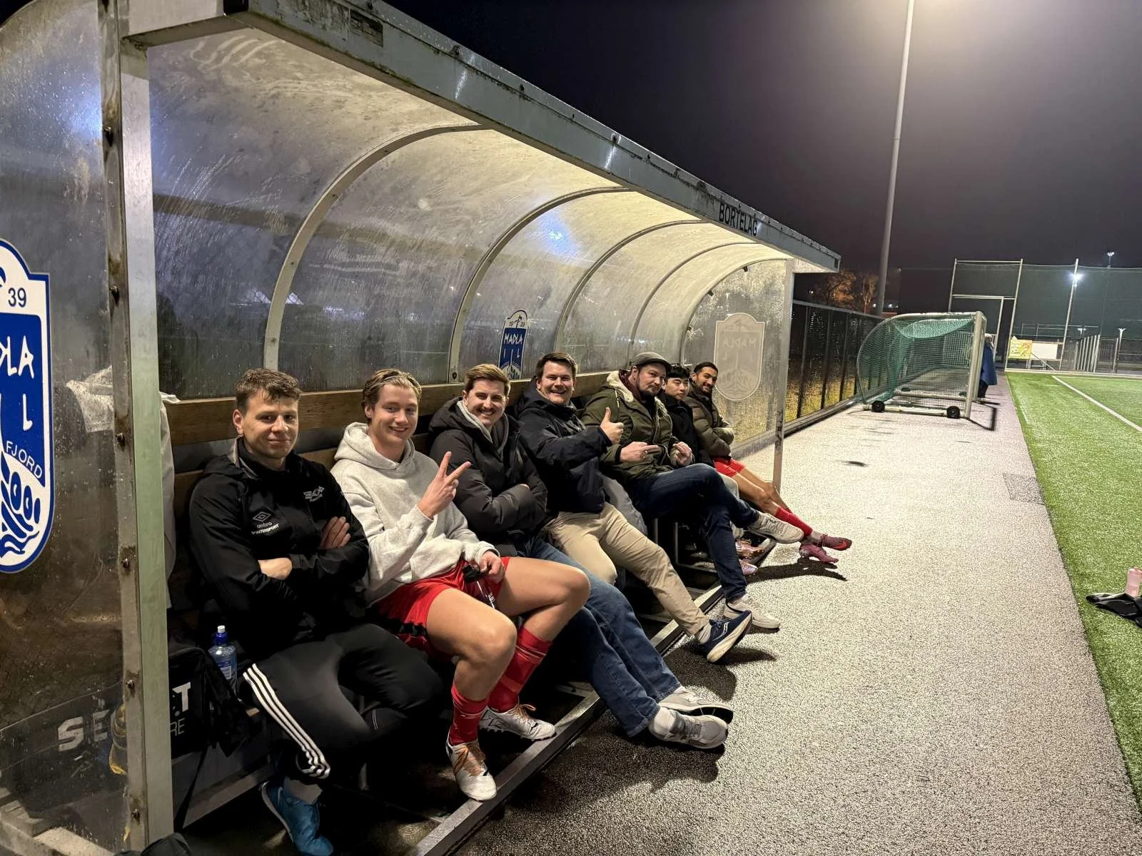 Andreas og Erlend + 3 skumle i regntøy på motsatt side av banen. Hyggelig benk også (ref. peace, tommel opp og f*** you)!